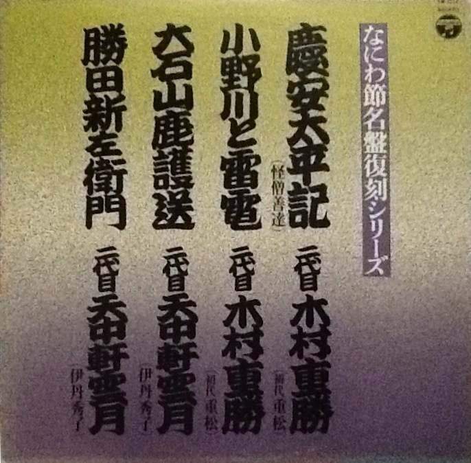 | なにわ節名盤復刻シリーズ | 慶安太平記 怪僧善達/小野川と雷電/大石山鹿護送/勝田新左衛門 | 二代目木村重勝(初代木村重松)/二代目天中軒雲月(伊丹秀子) | 不詳 | 不詳 | コロムビア | LP | FW-7114 | 1 | 1975.7 | 所蔵 | 未デジタル化 | 詳細 | |