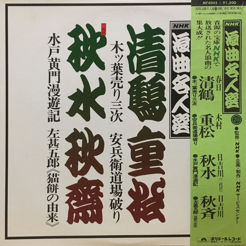 | NHK浪曲名人選20 | 木っ端売り三次/安兵衛道場破り/水戸黄門漫遊記/左甚五郎 猫餅の由来 | 春日清鶴/二代目木村重松/二代目日吉川秋水/初代日吉川秋斉 | 森たか子/木村美津江/日吉川つや子/阪井ます | ポリドール | LP | MF4045 | 1 | - | 所蔵 | 未デジタル化 | 詳細 | ||
