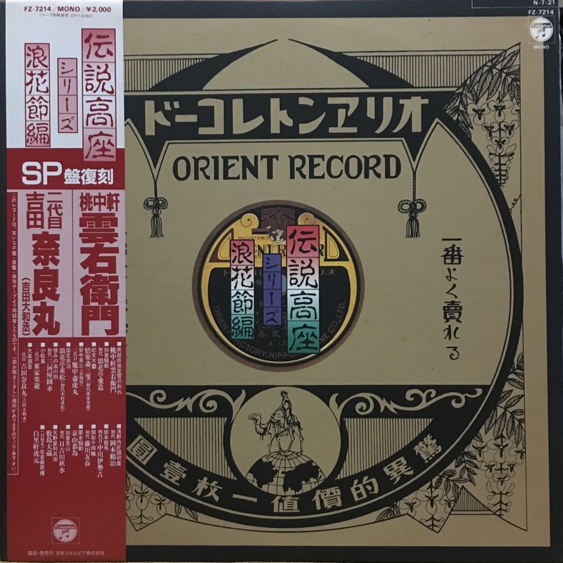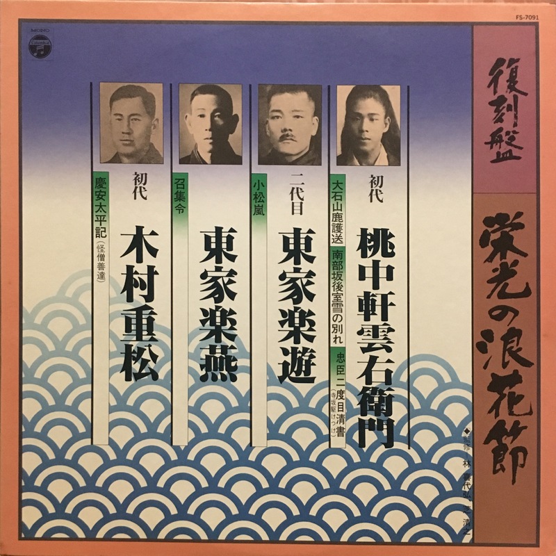 | 伝説高座シリーズ 浪花節編 | 桃中軒雲右衛門「南部坂後室雪の別れ」/初代浪花亭愛造「加賀騒動」/悟楽斉三叟(初代東家楽遊)「紀文大盡」/三代目鼈甲斎虎丸「安中草三郎(表題付)」/初代浪花亭重松(初代木村重松)「国定忠治」/初代三河家圓車「恨みの血の雨」/二代目東家楽遊「小松嵐」/二代目吉田奈良丸(吉田大和丞)「大高源吾」/初代岡本鶴治「浅野内匠頭切腹」/四代目中川伊勢吉「坂本龍馬」/初代藤川友春「関取千両幟」/初代京山恭為「栗本騒動」/初代日吉川秋水「加賀見山」/初代敷島大蔵「天野屋利兵衛」/白里軒虎元<デロレン祭文語り>「佐倉義民傅」 | 桃中軒雲右衛門/初代浪花亭愛造/悟楽斉三叟(初代東家楽遊)/三代目鼈甲斎虎丸/初代浪花亭重松(初代木村重松)/初代三河家圓車/二代目東家楽遊/二代目吉田奈良丸(吉田大和丞)/初代岡本鶴治/四代目中川伊勢吉/初代藤川友春/初代京山恭為/初代日吉川秋水/初代敷島大蔵/白里軒虎元 | 不詳 | コロムビア | LP | FZ-7214 | 1 | - | 所蔵 | デジタル化済 | 詳細 | ||