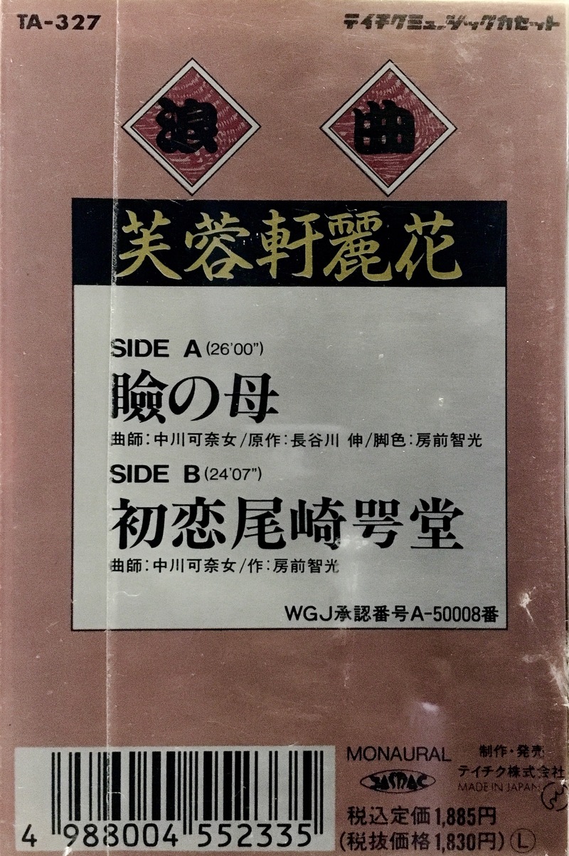 | 瞼の母/初恋尾崎咢堂 | 芙蓉軒麗花 | 中川可奈女 | 原作:長谷川伸.脚色:房前智光/作:房前智光 | テイチク | カセット | TA-327 | 1 | 所蔵 | 未デジタル化 | 詳細 | |||
